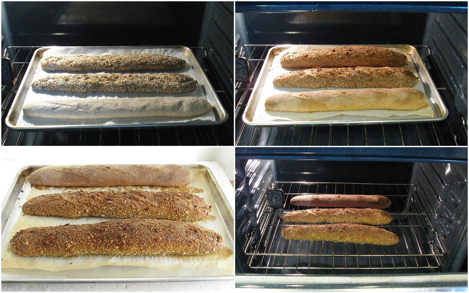 Notice the loaves have indeed risen a bit (top picture), though again, the rise is nothing like that you'd get with a standard white-flour baguette.