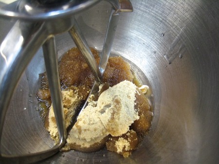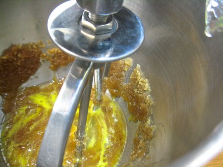 In your mixer's bowl, combine 3/4 cup (106g) brown sugar and 1/2 cup (99g) vegetable oil until well-blended.