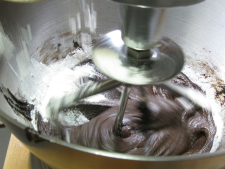 Add all of the milk, beating at low speed to combine.