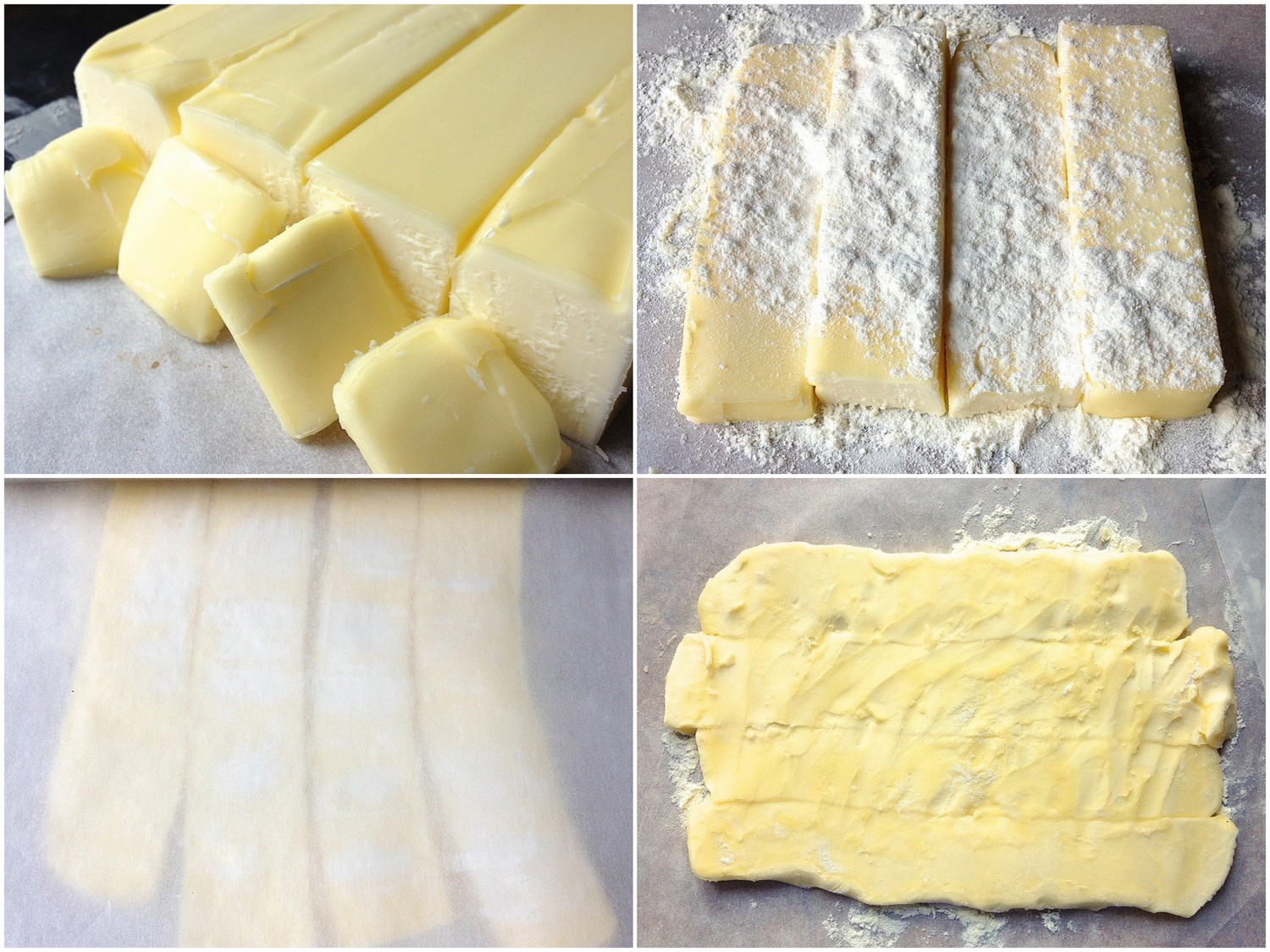 Cut each stick of butter in half lengthwise, to make eight long rectangles. On a piece of floured parchment or plastic wrap, line up four of the butter pieces side by side, to form a rectangle. Sprinkle lightly with flour, and cover with another piece of parchment or plastic wrap.