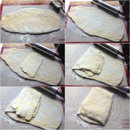 Turn the dough 90°, so a 12" side is closest to you. Roll the dough into a 10" x 24" rectangle (approximately). Fold each side into the center; then fold one side over the other to make a rectangular packet about 6" x 10".
