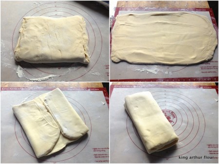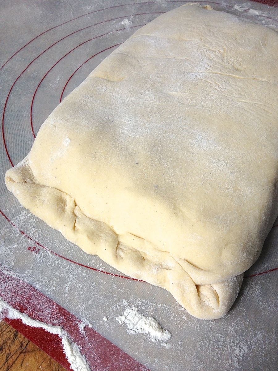 Remove the dough from the fridge, and again roll it into a rectangle about 10" x 24". Fold it into a packet as you did before; it'll be about 7" x 12". Give it another short rest in the fridge.