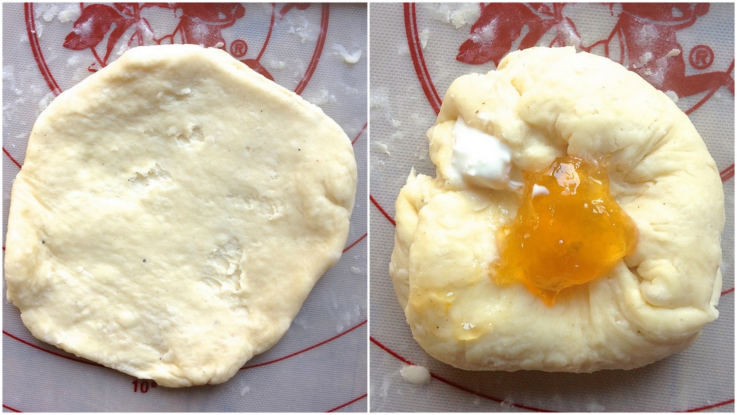 Filled round? Well, that's kind of awkward, considering we're starting with a square piece of dough. But let's give it a try. Dollop filling in the center, then gather all the edges up – rather than just four corners – and squeeze them together at the top. I've added another spoonful of filling on top, just to see what'll happen.