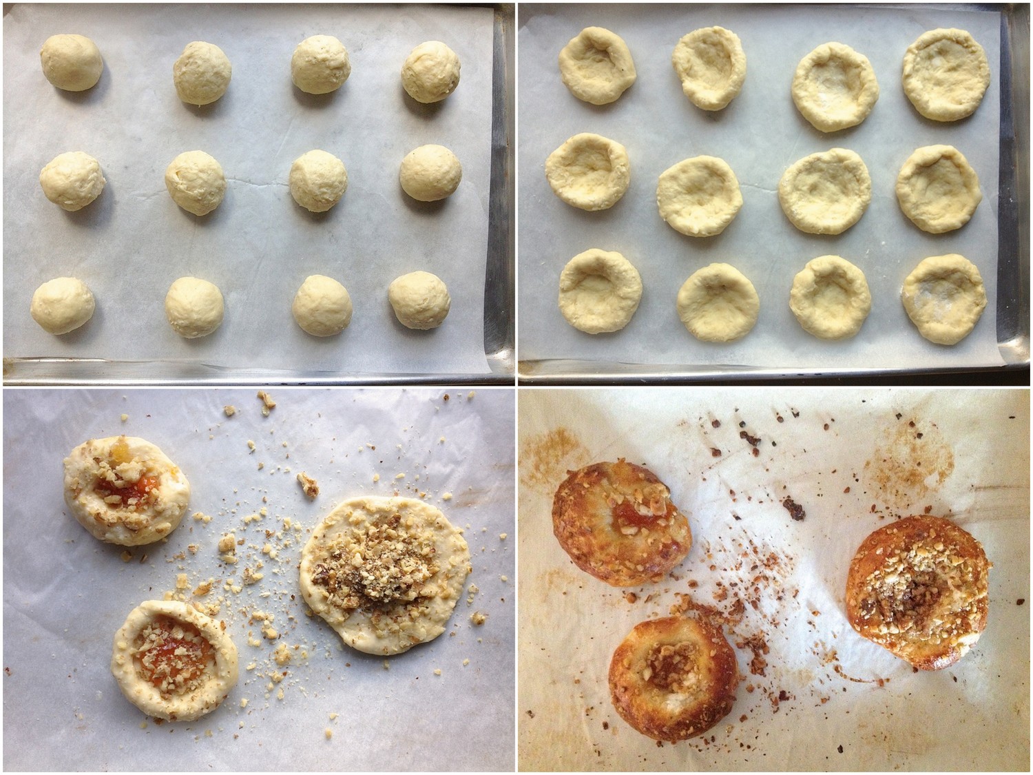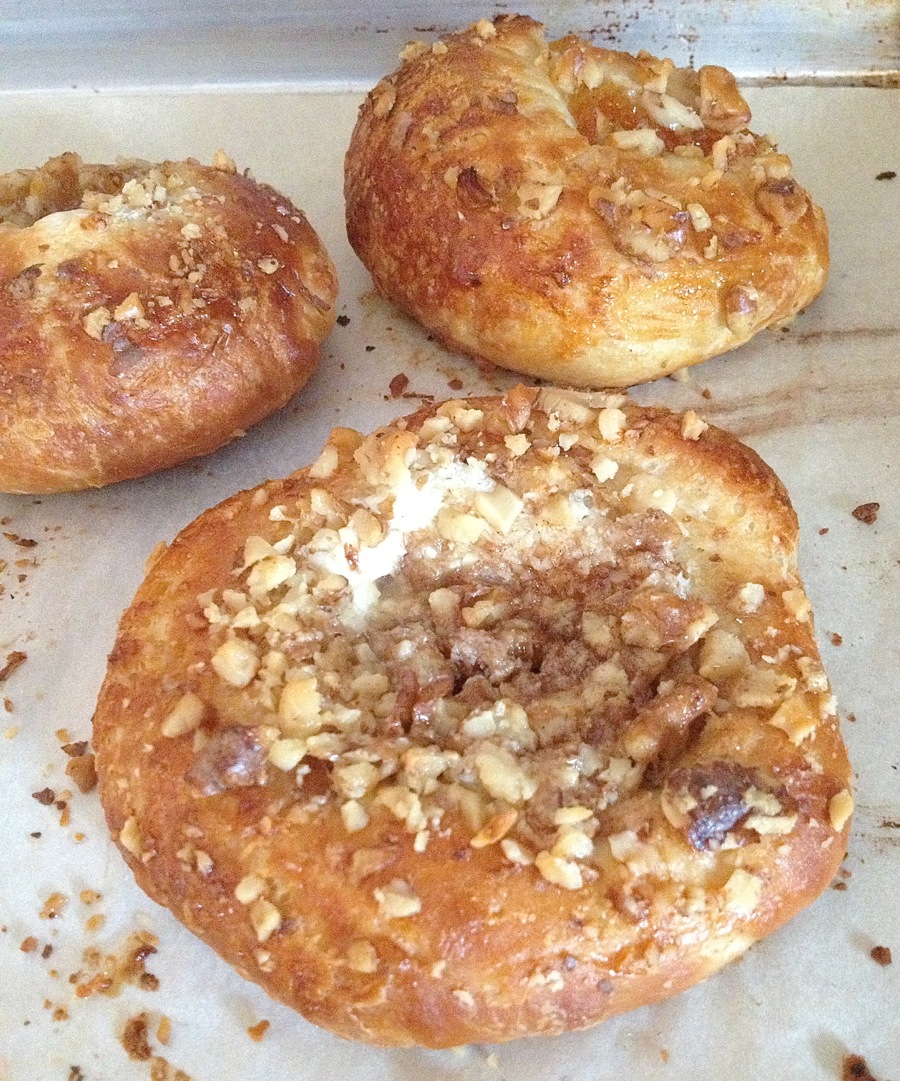 Note: As you can see in the photo above (bottom row, left), at the last moment I decided to take one of the risen rounds and simply flatten it, leaving the edges just slightly puffy. I spread filling across the center of the disk, creating a circle of filling about 2" in diameter. Then I scattered crushed walnuts over the filling.