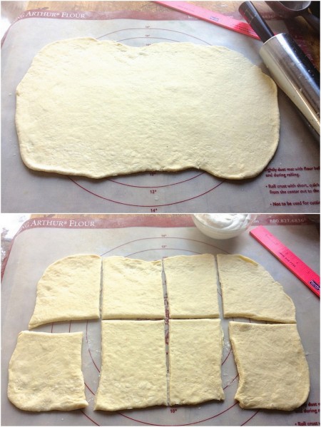 Roll the dough into an 8" x 16" rectangle, and cut it into eight 4" squares. Notice I haven't managed to cut a single "square;" a bunch of raggedy rectangles is more like it. I'm the anti-Martha, so do as I say, not as I do!