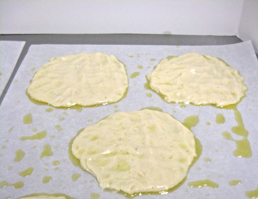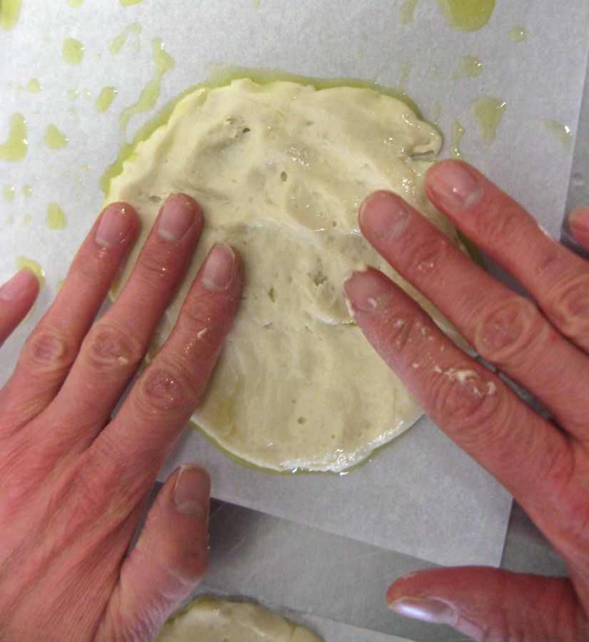 ...flatten it into a 4" to 5" round. Want a smoother finished look? You can use a pastry roller with an additional piece of oiled parchment over the top of the dough to shape your rounds.