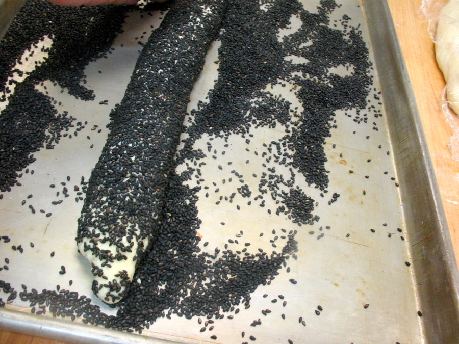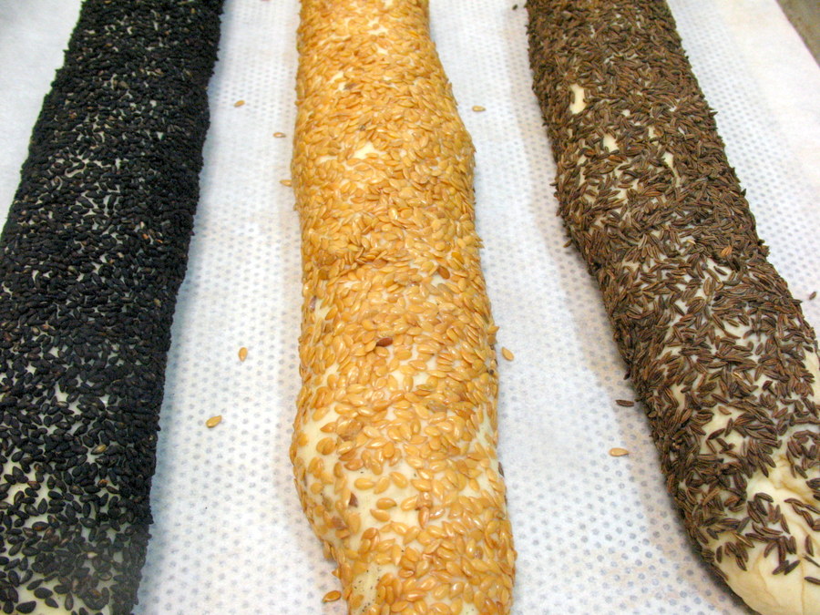 The first will have a slightly damp, lint-free kitchen towel on it. The second will be a baking sheet with an even layer of your seeds of choice; and the third will be a resting place for the seeded strands after they've been coated. This can be the same parchment-lined baking sheet on which the shaped and seeded loaf will rise and bake.