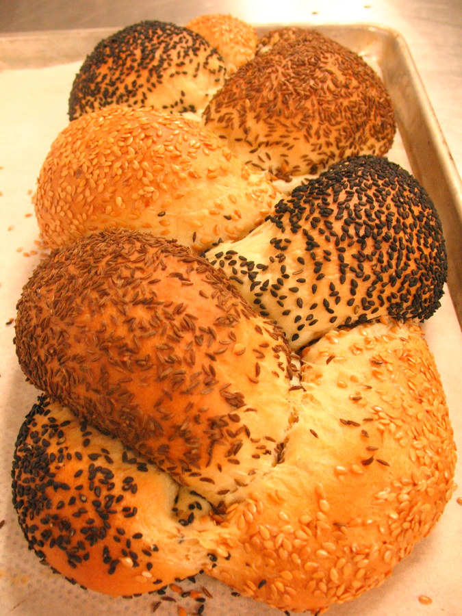 Start with your favorite bread dough, made by hand or machine. While the dough is rising, prepare three baking sheets or parchment-lined work areas.