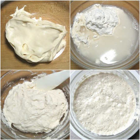 Beginning with 4 ounces of dormant starter, I add 4 ounces each King Arthur Unbleached All-Purpose Flour (scant cup) and lukewarm water (1/2 cup), stirring to combine.