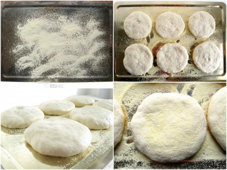 Place the rounds, evenly spaced, onto cornmeal- or semolina-sprinkled baking sheets. Cover with plastic wrap, and let them rise until light and puffy, about 45 to 60 minutes. Sprinkle with additional cornmeal or semolina.