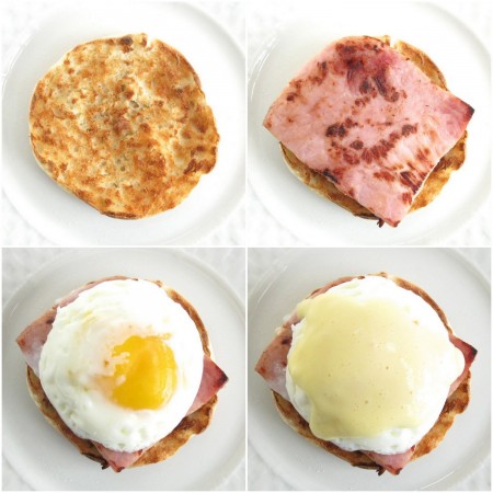 Eggs Benedict, for any of you unfamiliar with this fancy breakfast favorite, is an English muffin half, toasted and topped with a slice of ham, a poached egg, and hollandaise – a rich butter/egg/lemon sauce.