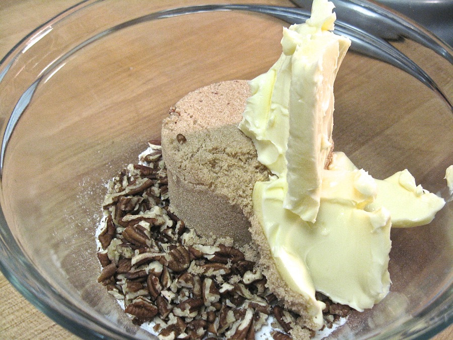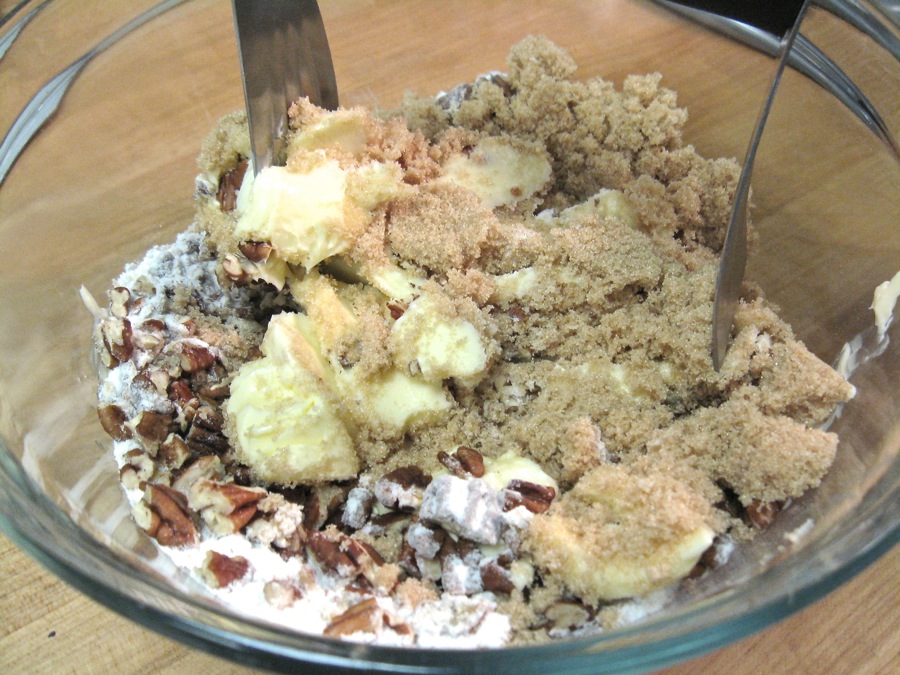 They'll be coarsely crumbly. Set the crumb topping aside while you prepare the cake batter.