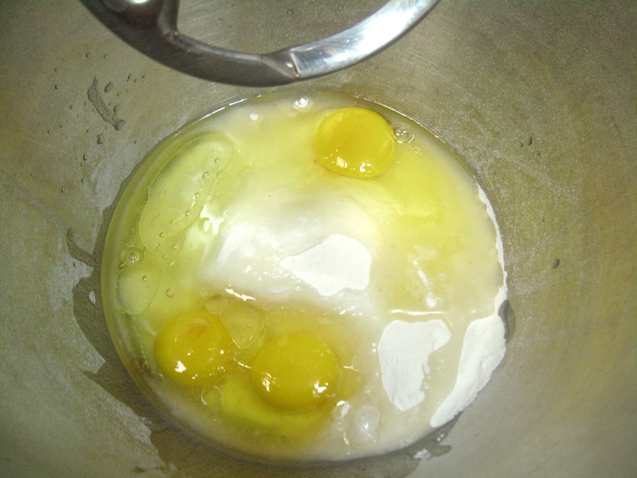 Mix the batter, starting with blending the 3 eggs, 6 tablespoons (85g) of oil or butter, and the remainder of the muffin mix.