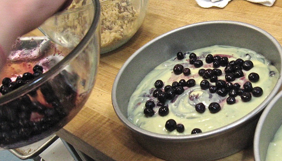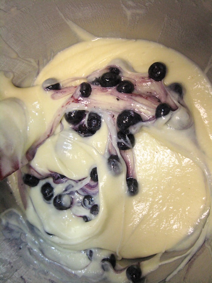 Gently fold in 1/2 cup blueberries. It is important to use either defrosted (drained) or fresh blueberries rather than frozen ones to avoid adding too much liquid to the batter.