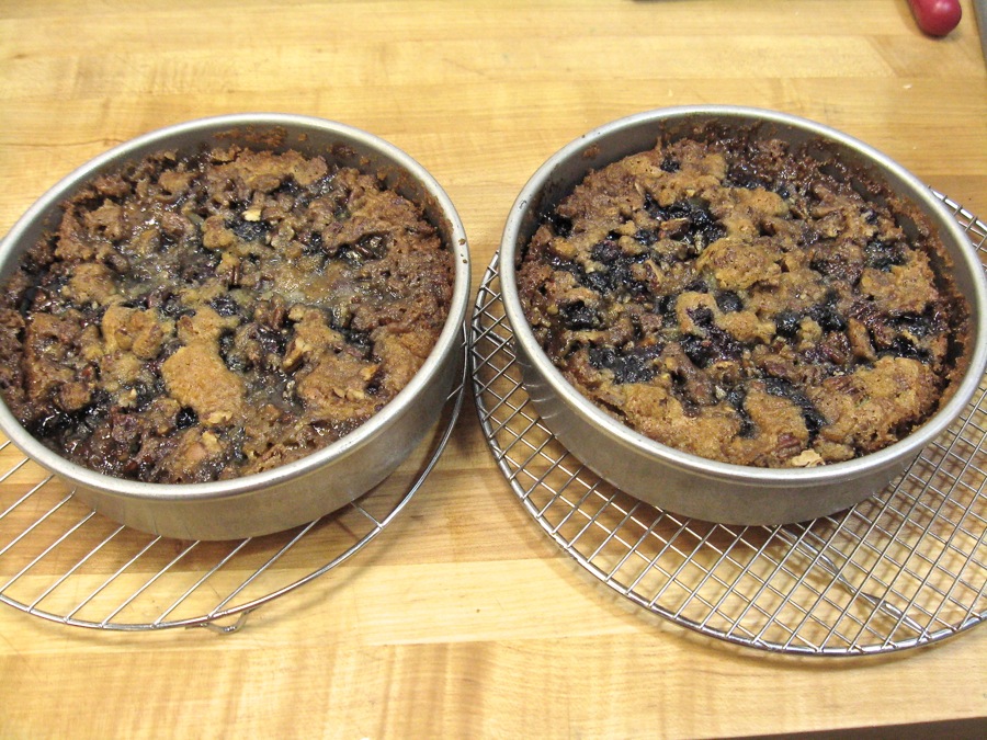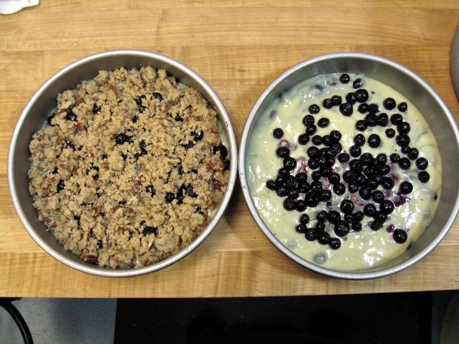 The cake(s) should be a lovely golden brown and ever-so-tempting with their nutty topping, juicy blueberries, and warm, soft, tender crumb.