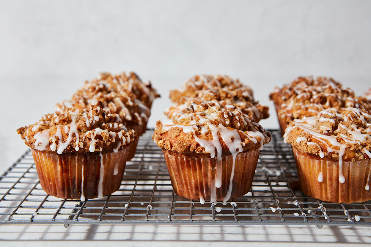 While it's totally optional, a drizzle of icing atop the cooled muffins is a felicitous final touch. Mix 2/3 cup confectioners' sugar, a pinch of salt, and 1 tablespoon milk, or enough to create a pourable glaze. Spoon/drizzle it over the cooled muffins.