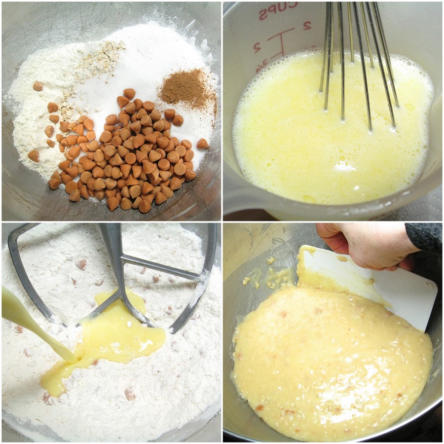 Add the liquid mixture to the dry, stirring just until combined. Be sure to scrape the sides and bottom of the bowl to incorporate any sticky residue.