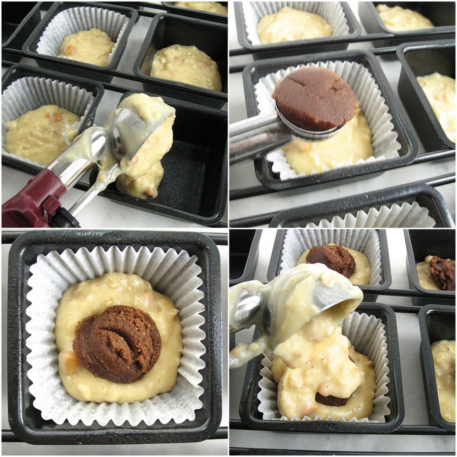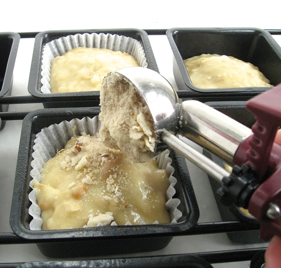 Divide half the batter evenly among the muffin cups. A heaped tablespoon cookie scoop (photo, top left) is just about the right amount for each cup.