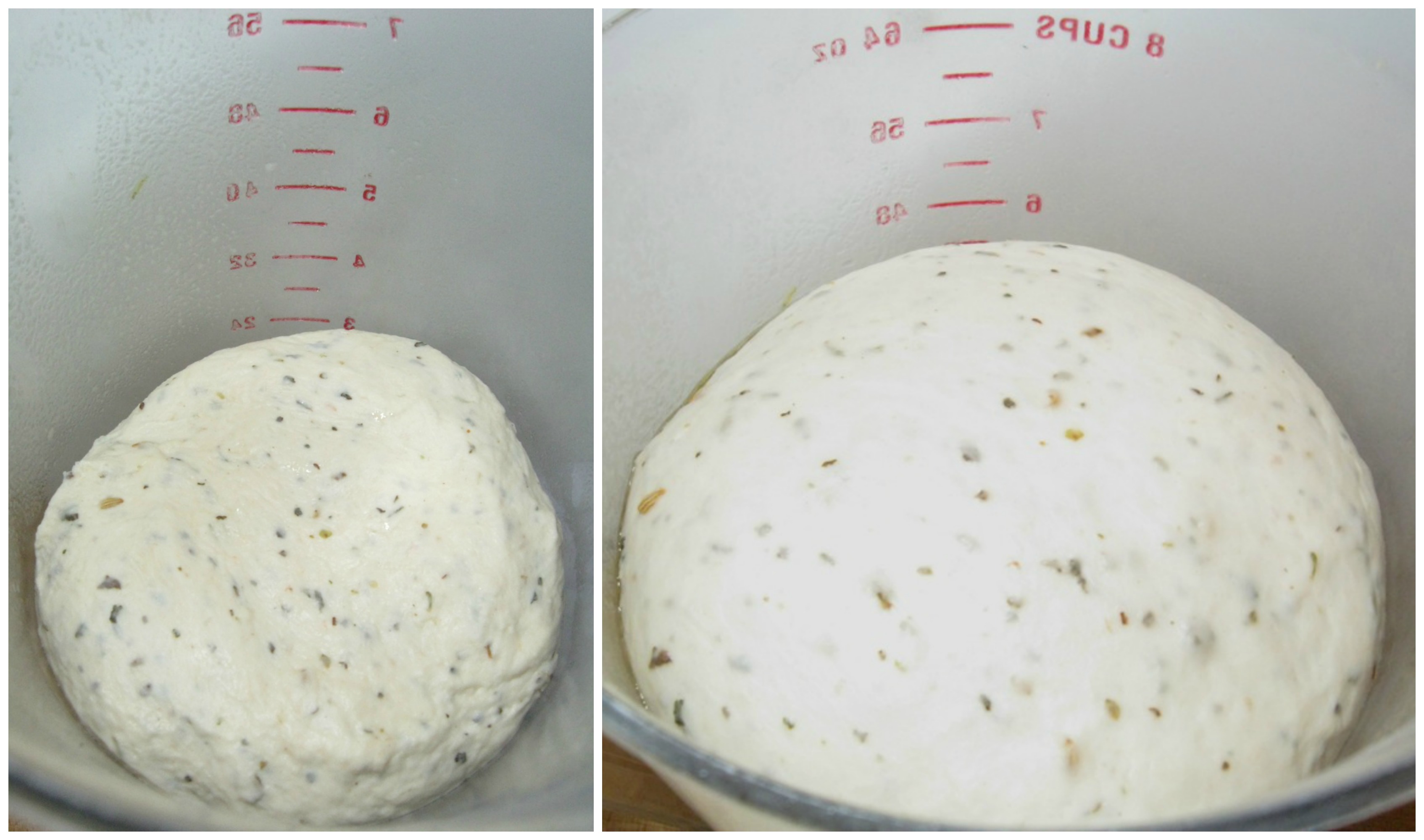 I like to use a large measuring cup to raise my dough – notice how easy it is to see that this dough has just about doubled, going from 3 to 6 cups volume.