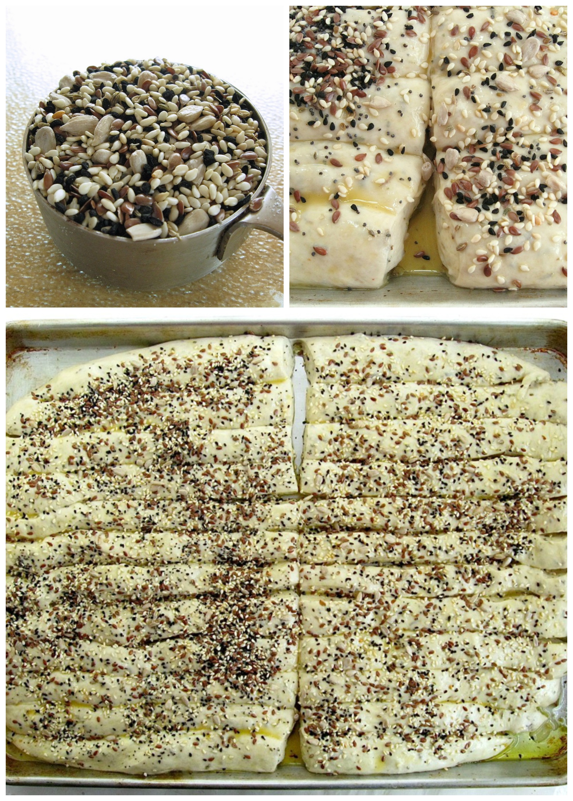 Brush the strips with the egg wash, and sprinkle on about 1/4 cup (43g) seeds. I'm using our Artisan Bread Topping – a mixture of flax, toasted sesame, black caraway, midget sunflower, poppy, and anise seeds. It's crunchy, it's pretty, and it adds just the right flavor/texture notes to these soft breadsticks.