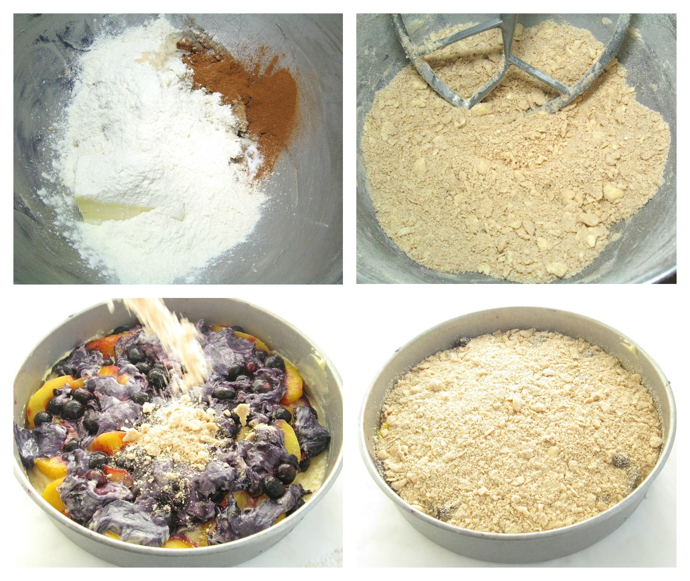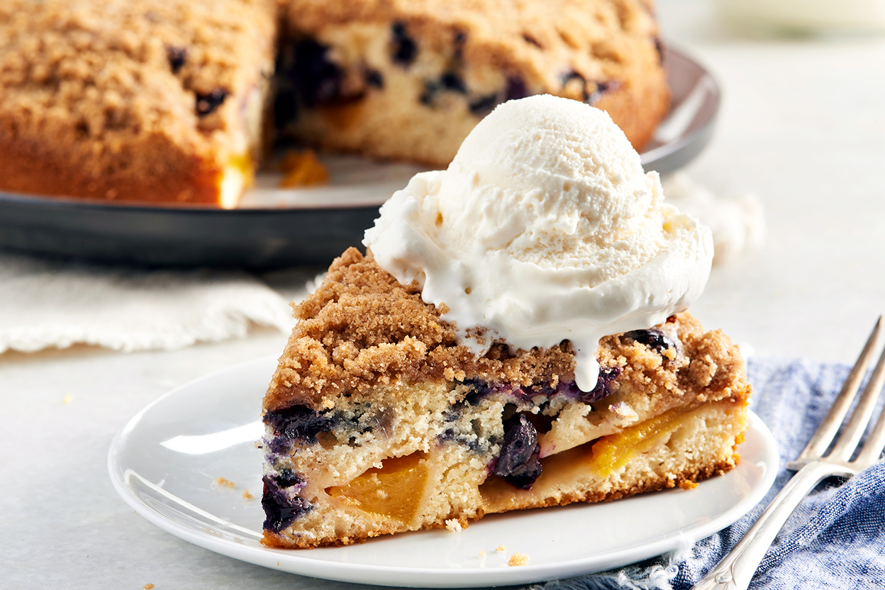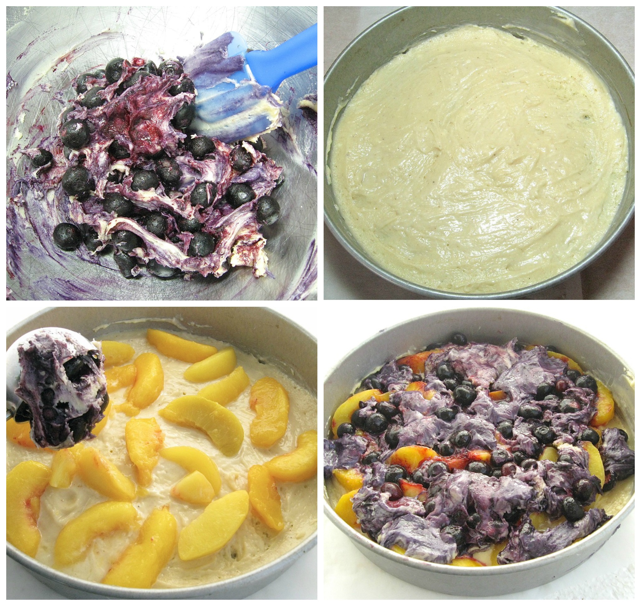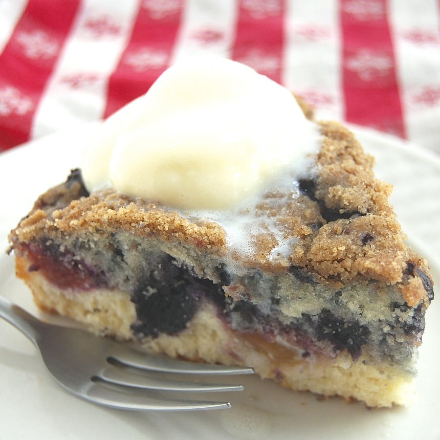 It's a fresh fruit coffeecake, pure and simple. The following version features one of our favorite fruit combinations, blueberries and peaches; if you prefer nectarines and strawberries, blackberries and raspberries, or just plain apples – whatever your fruit desire – go for it.