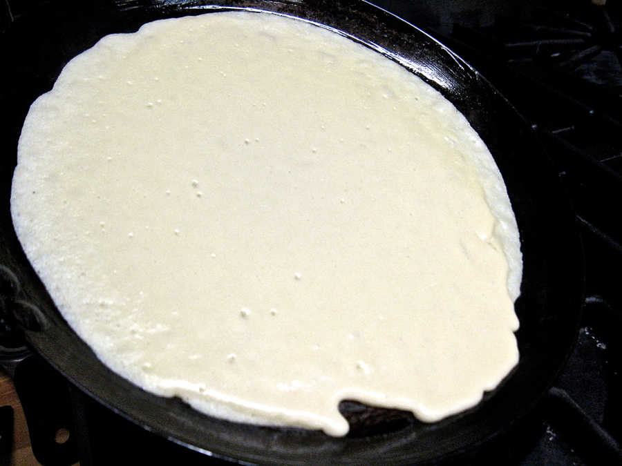Heat your crêpe pan or a cast iron pan over medium-high heat. Wipe the bottom of the pan with a bit of butter (a paper towel works well). Pour a scant 1/3 cup batter into the bottom of the pan,
