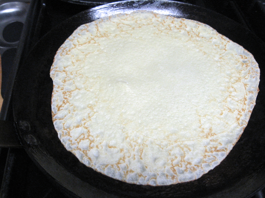 Cook the crêpe until the bottom begin to brown and you can slide a spatula under it to flip with ease. Cook briefly on the other side, place on a warm plate, and cover until the remaining batter is cooked.
