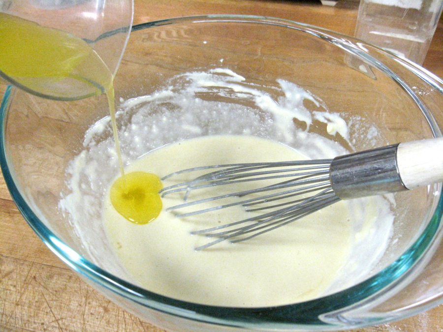 Make a shallow well in the flour mixture and pour in about half the liquid.