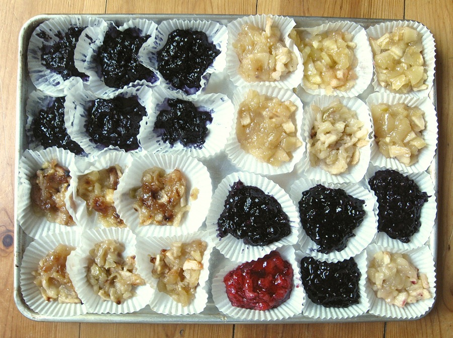 I add a few more tests along the way, and chuck a few obvious failures. And at the end of the day, I'm able to examine over 2 dozen small mounds of thickened fruit, comparing and contrasting them for thickening ability, clarity, and flavor.