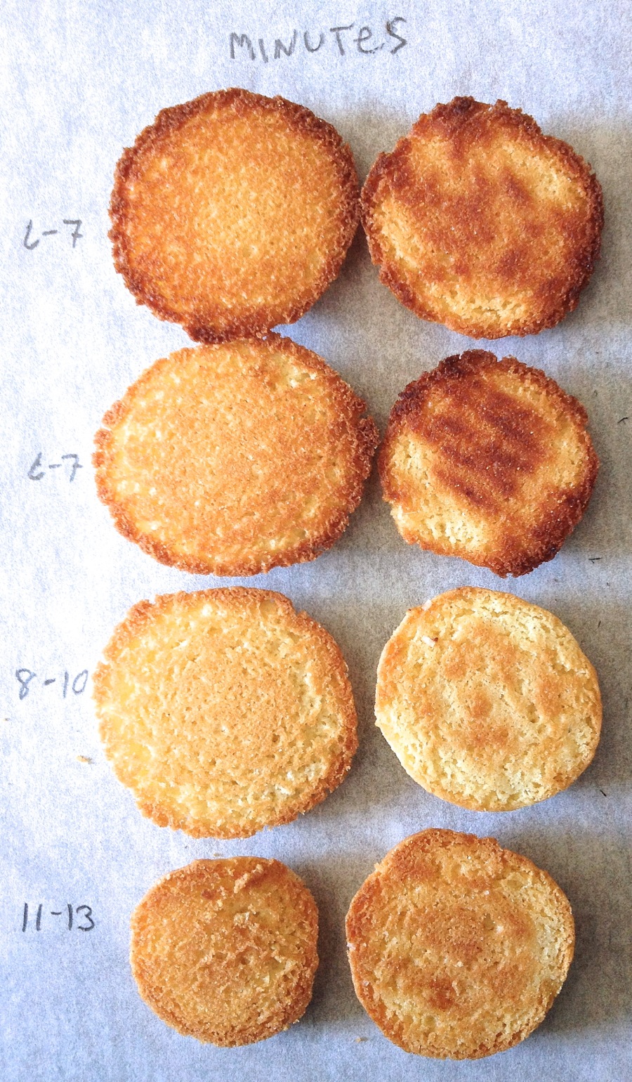 The time range (e.g., 11 to 13 minutes) refers to whether or not the cookie was baked without parchment (e.g., 11 minutes) or with parchment (e.g., 13 minutes).