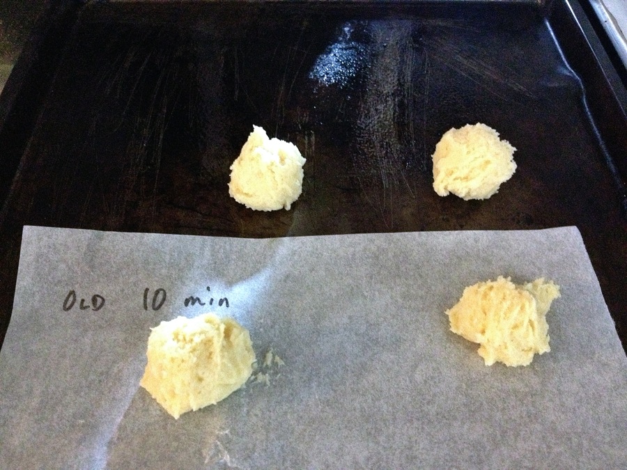 Using the same batch of cookie dough and same oven settings, I followed the same process again – four pans, half parchment/half greased. But this time, I paid attention to the cookies as they baked, and removed them from the oven when I judged they were done.