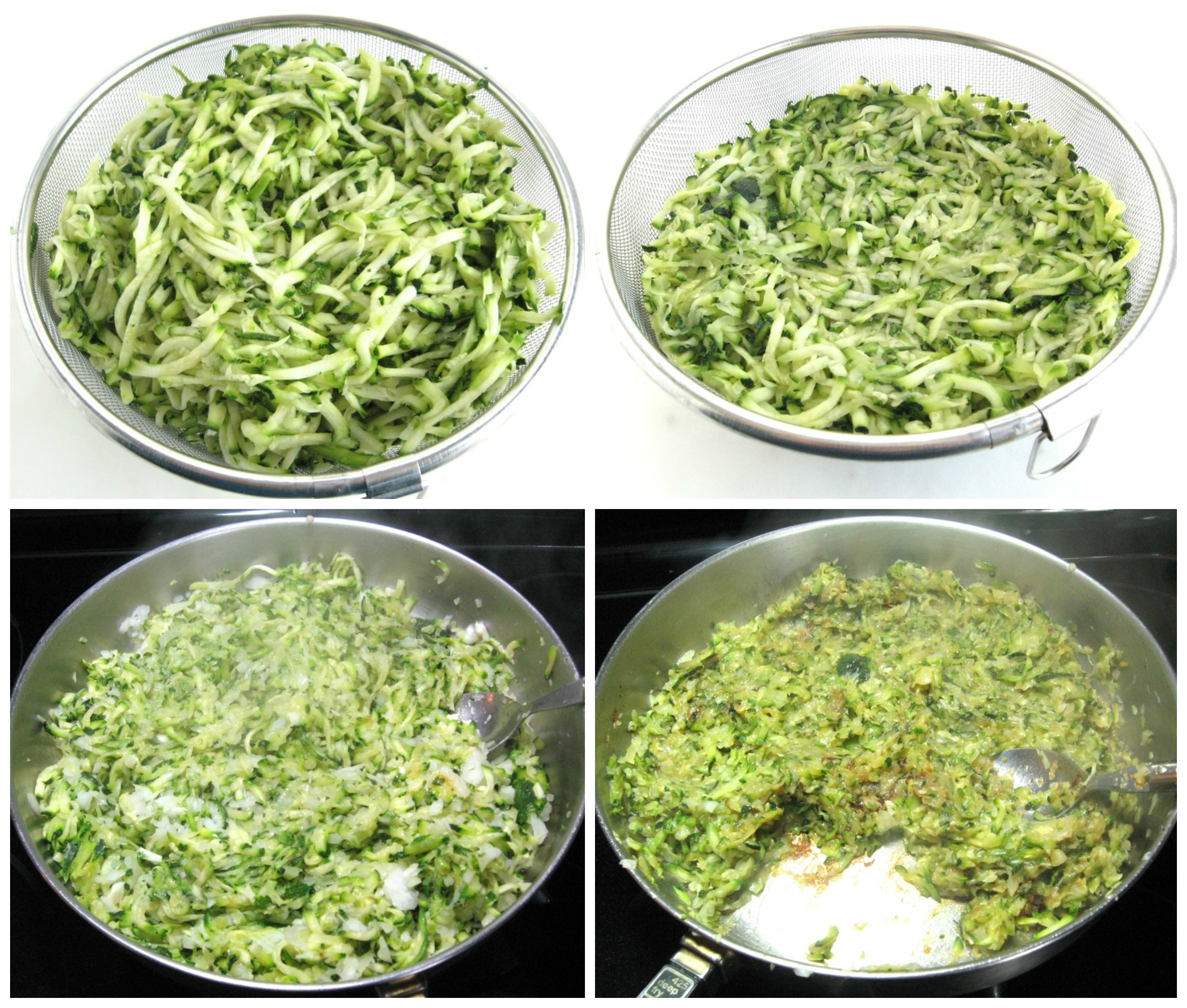 Stir 1/2 teaspoon salt into the grated squash. Place the squash in a colander, weigh it down, and let it drain for an hour or so.