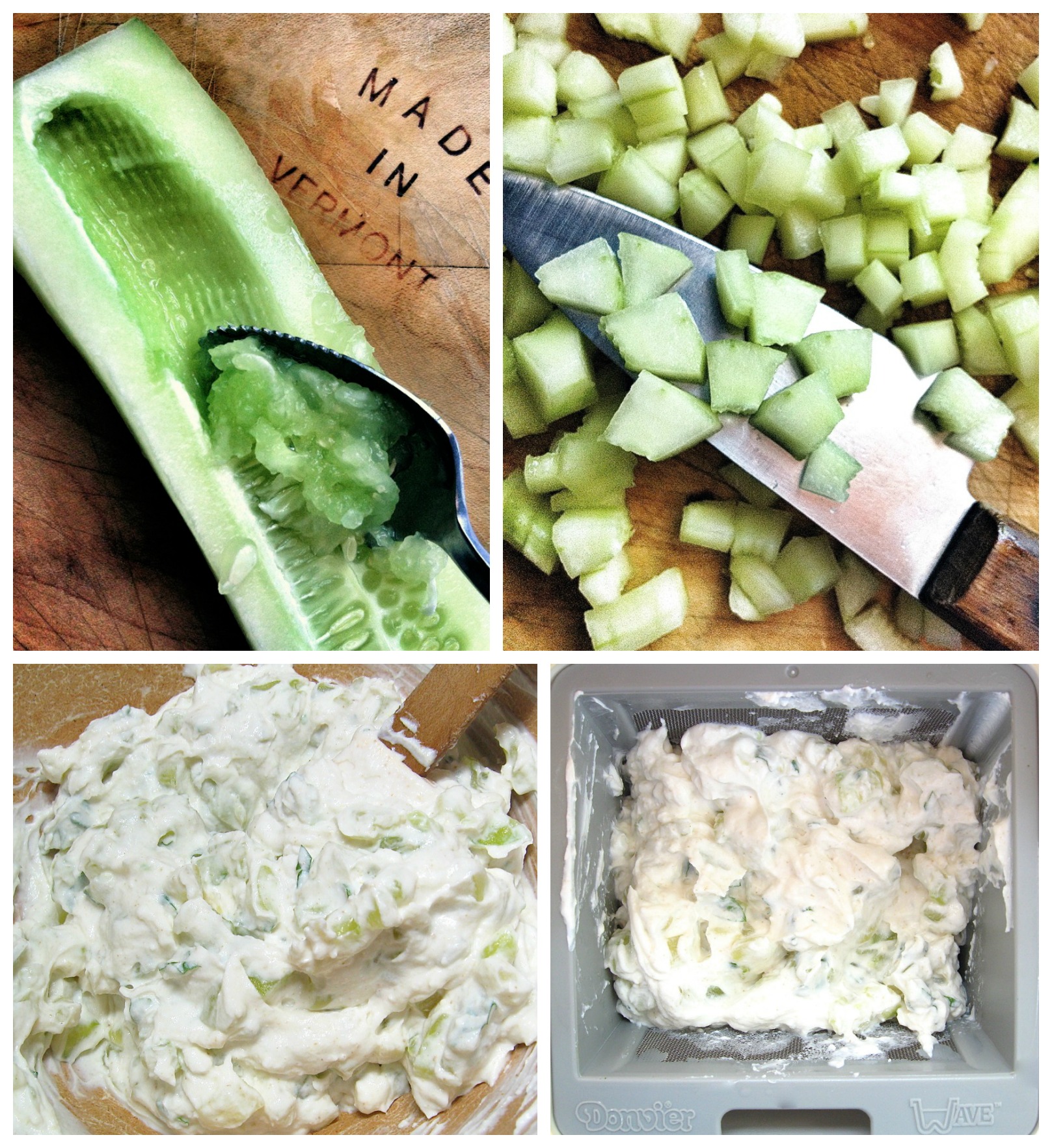 Slice the cucumber lengthwise, and use a spoon to scoop out the seeds. I find a serrated grapefruit spoon works well for this task.