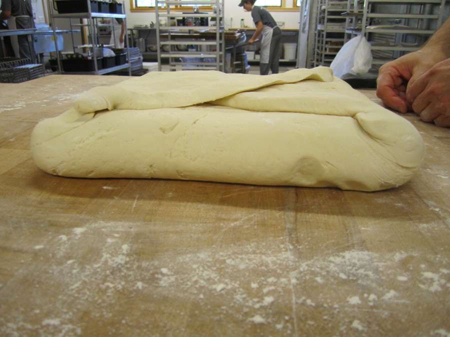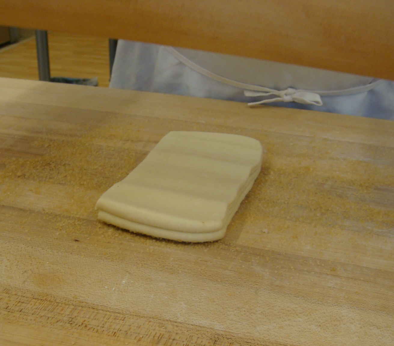 Now that we have a long, thin rectangle of dough, it's folded in half. The seam is off center, and there's slight overlap to make sure that every bit of dough gets a layer of butter.