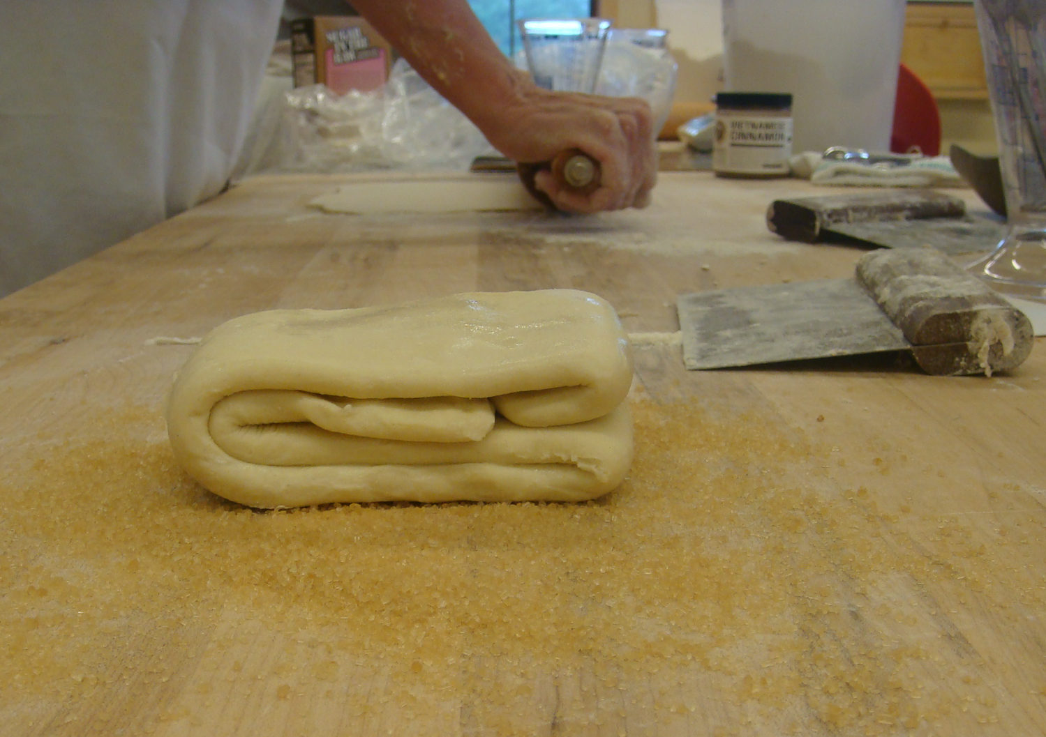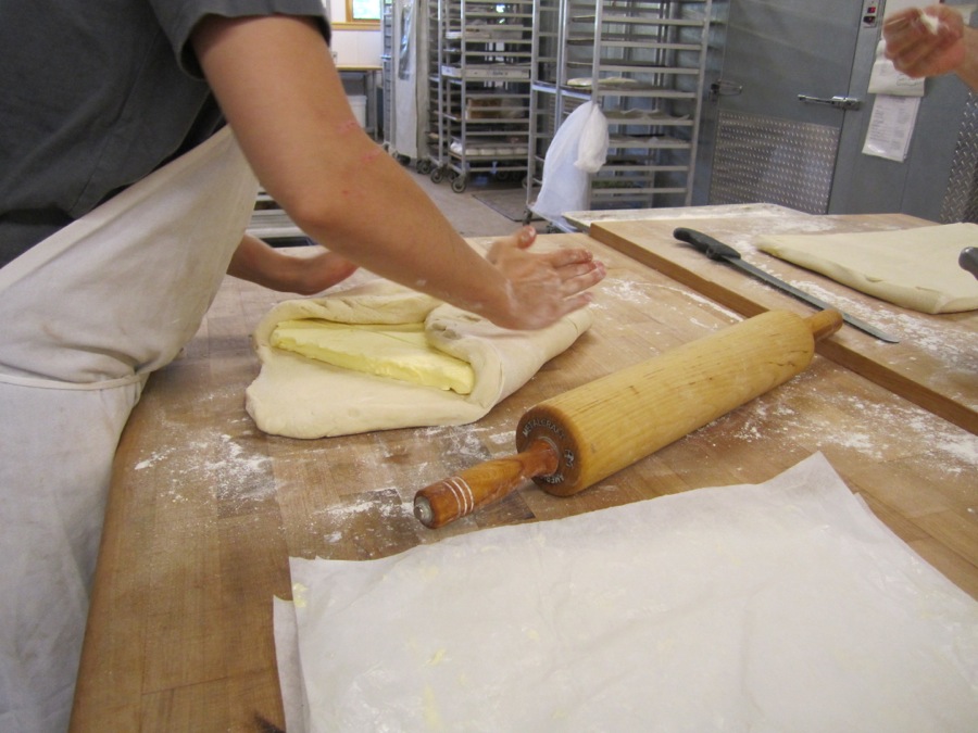 Meanwhile, the cold butter is pounded with a rolling pin to become pliable, and then formed into a square. The lamination process happens in the same way as in the professional bakery – except everything is done by hand ,with a rolling pin, rather than using the dough sheeter.