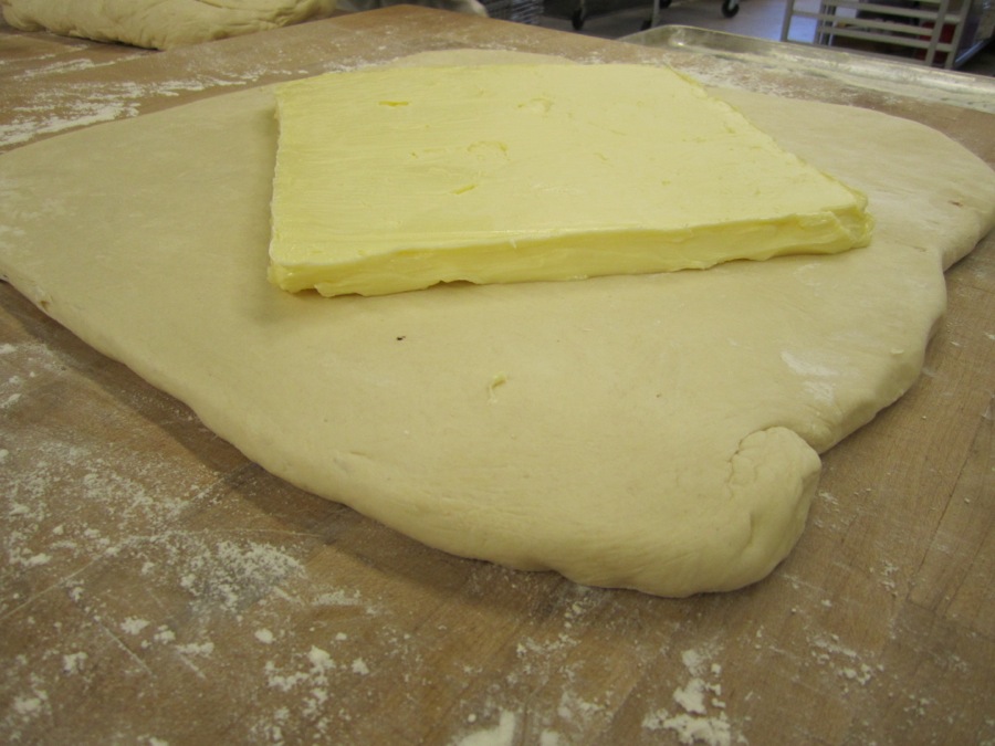 Place a square of cool, but pliable butter on the dough. Soft butter will melt into the dough – or more likely ooze out during the layering process.