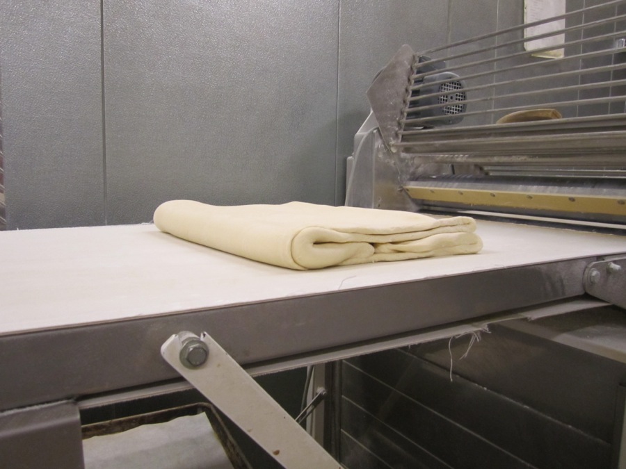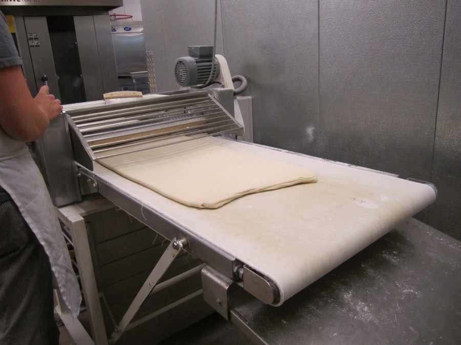 In most professional bakeries where puff pastry is made, you'll find a dough sheeter. Think of a giant pasta machine, the kind that has two adjustable-width rollers for dough to pass through.