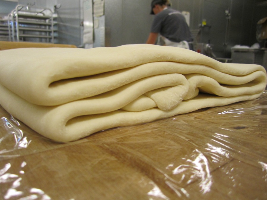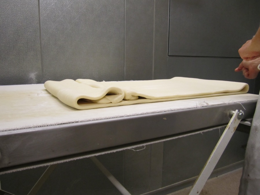 The process of rolling and folding is repeated three more times, for a total of four folds resulting in over 500 layers.