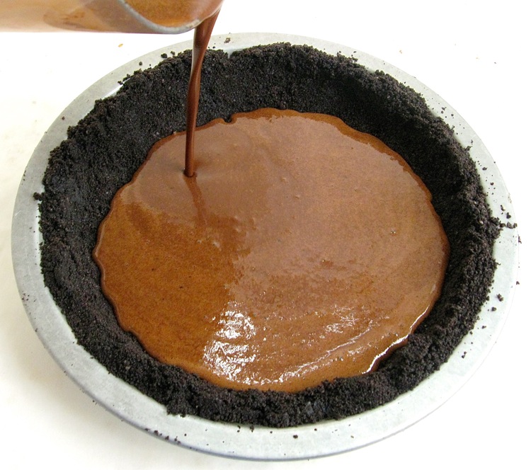 Here's how I do it: Crush 24 cream-filled chocolate sandwich cookies (about 9 1/2 ounces cookies) in your food processor. Add 4 tablespoons melted butter; pulse to blend. Press the mixture into the bottom and up the sides of a 9" pie pan. Place in the fridge to chill while you make the pots de crème, which will now become pie filling.