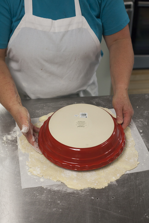 Big enough? Check with the pan above the dough, inverted. Make sure there’s about 2” more dough than the pan’s perimeter. People always ask: "What's the best pan for pie?" "Any pan with pie in it is a good pan", I reply.