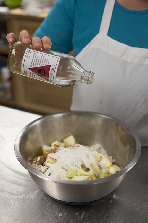 Now for the filling. I like to use at least 3 types of apples, for more complex, interesting flavor. This pie has Granny Smiths, Braeburns, and Honeycrisps in it. Sugar, cinnamon, flour. Some boiled cider and lemon juice for brightness and intensity.