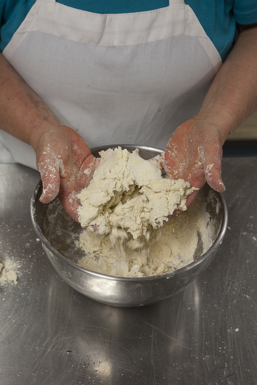 Now the tricky bit. Add the water and toss with a fork, but keep things on the dry side. Just enough so that some of the dough will hold its shape with a gentle squeeze, but with about a third of the mixture still pretty dry.