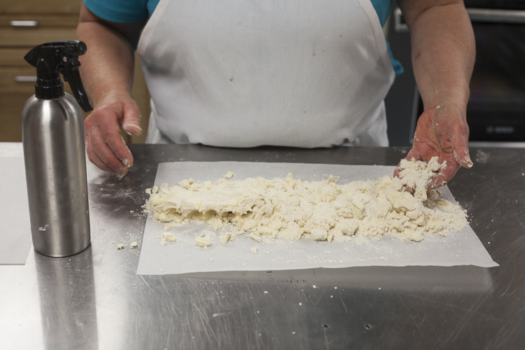 Repeat, spritzing as necessary, until the dough comes together, with some dry crumbs still shedding around the edges.