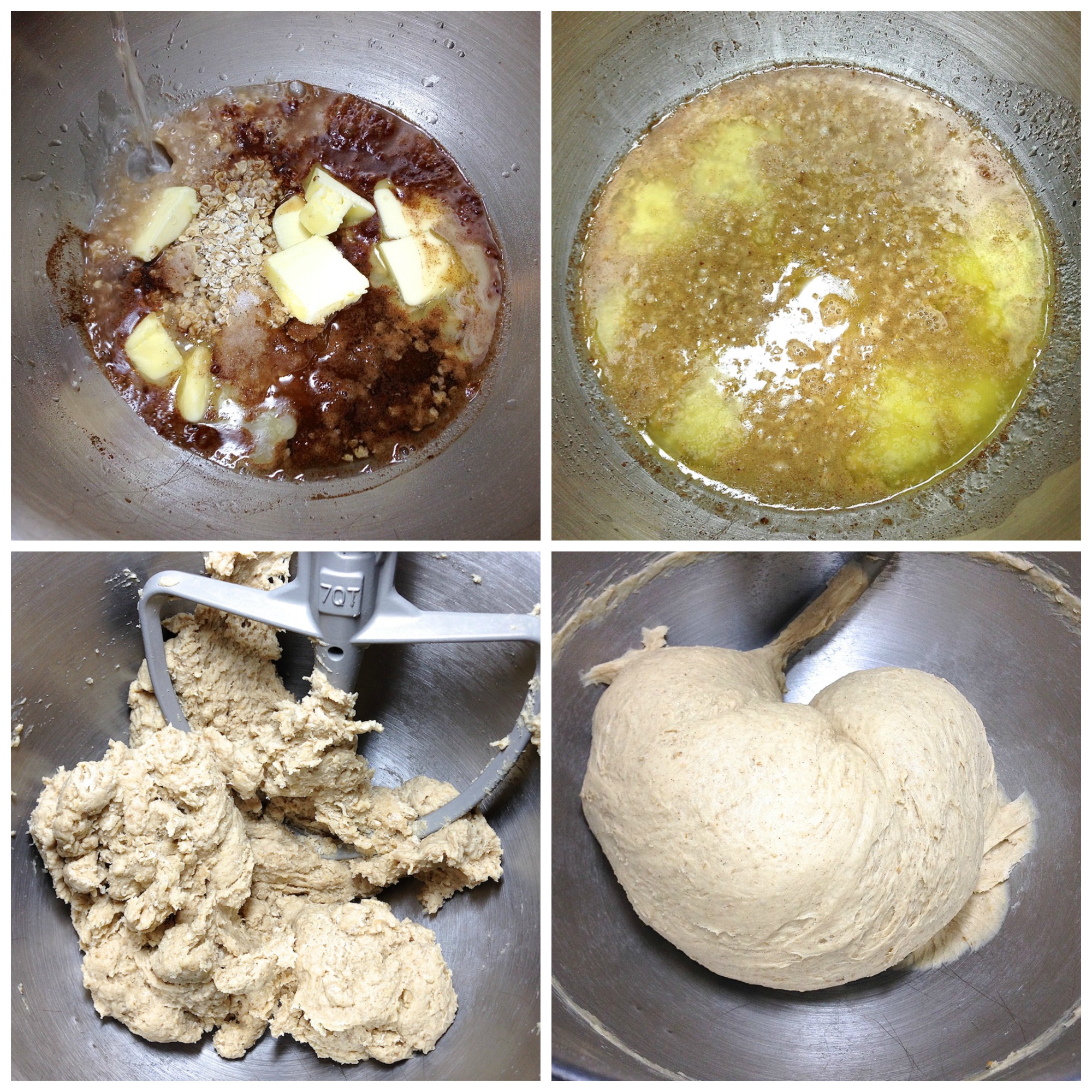 Stir in 2 cups (454g) boiling water. Let everything cool to lukewarm, about 10 to 15 minutes. This first step melts the butter, and softens the oats, plus gives them a chance to absorb some of the water; this will make your bread easier to knead.