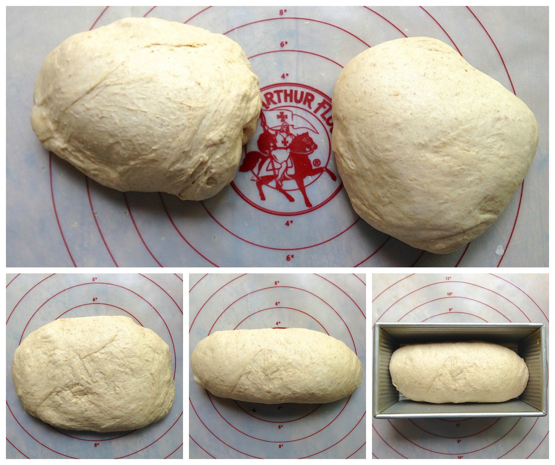 Once the dough has risen nicely, gently deflate it. Divide it in half, and shape each half into a log. Gently pat each piece of dough into an oval, then fold over to make a log. Place the loaves in two greased 8 1/2" x 4 1/2" loaf pans.