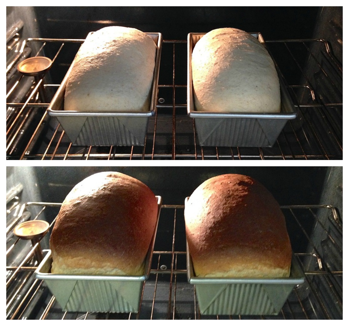 Notice how the loaves rise quickly once they're in the oven – this is called "oven spring." And oven spring is the reason you don't want your loaves to rise TOO high before you bake them. If a loaf looks beautifully and fully risen before it bakes, it'll collapse once it hits the oven's heat. Remember the balloon? POP. So, a good rule of thumb is, bread shouldn't rise more than about 1" over the rim of the pan before going into the oven.