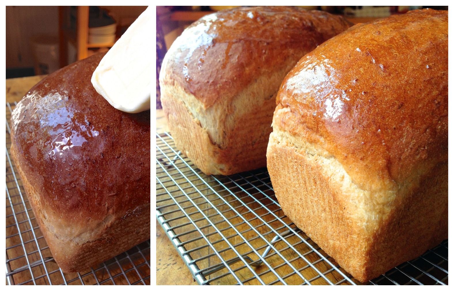 Turn the loaves out onto a rack; they should slip right out of the pan. I like to run a stick of butter over the top, which gives the crust a satiny appearance, soft texture, and wonderful flavor.