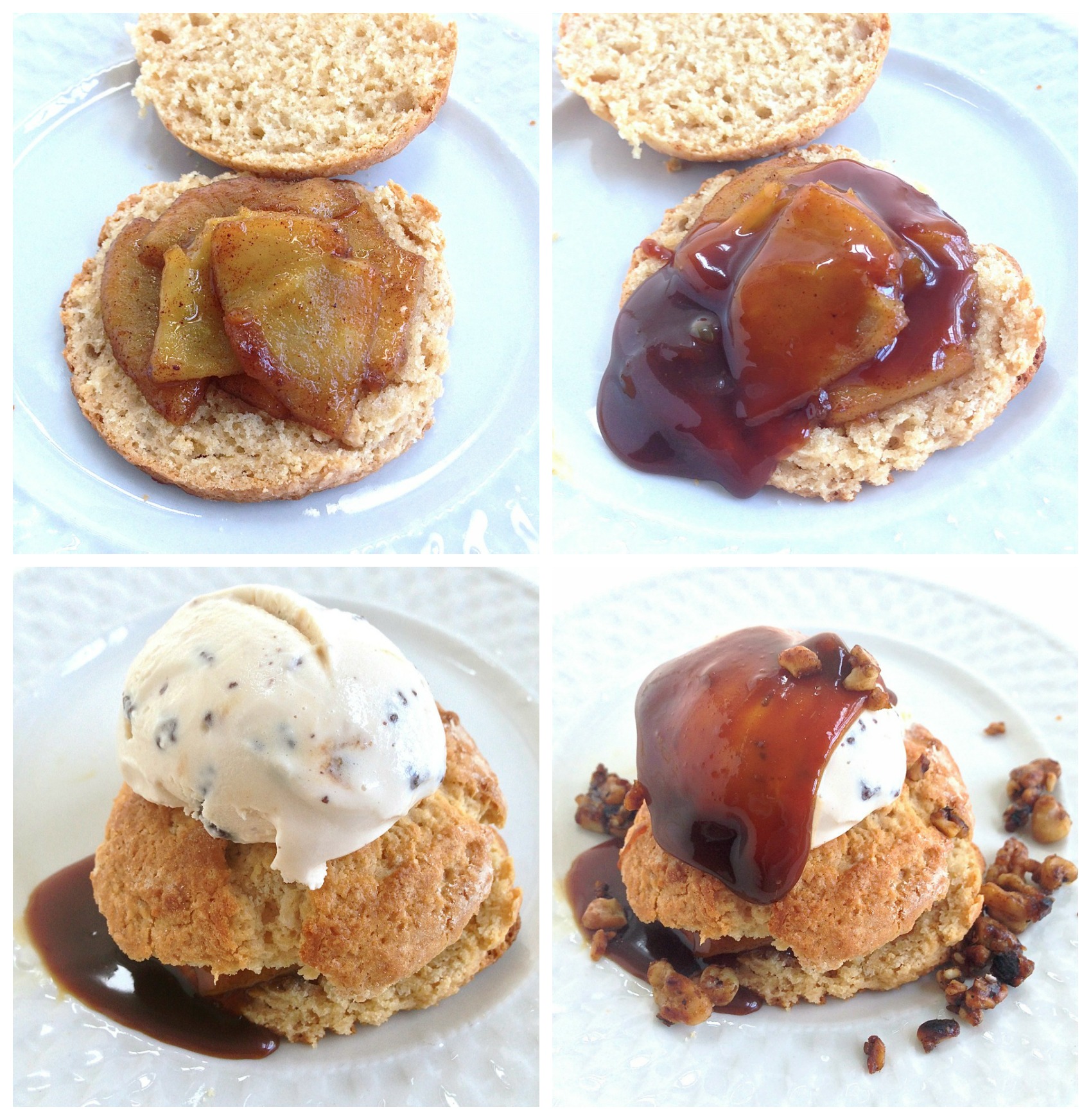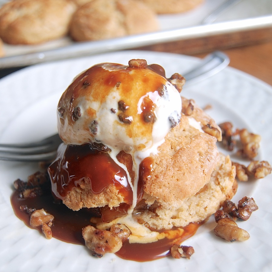 Spoon 5 to 6 apple slices over the bottom half of each biscuit. Drizzle with some caramel sauce, then place the tops of the biscuits over the apples. Add a scoop of ice cream, more caramel sauce, then sprinkle with the candied walnuts.