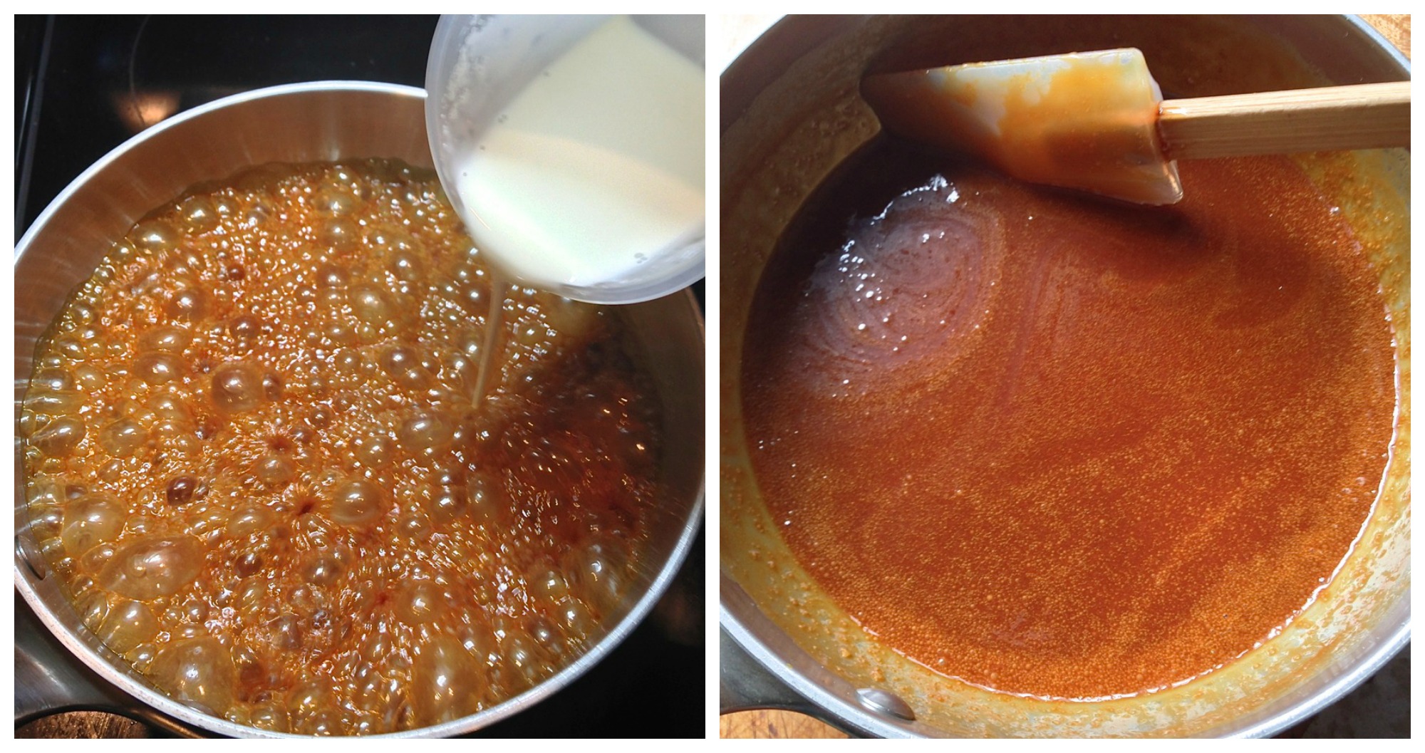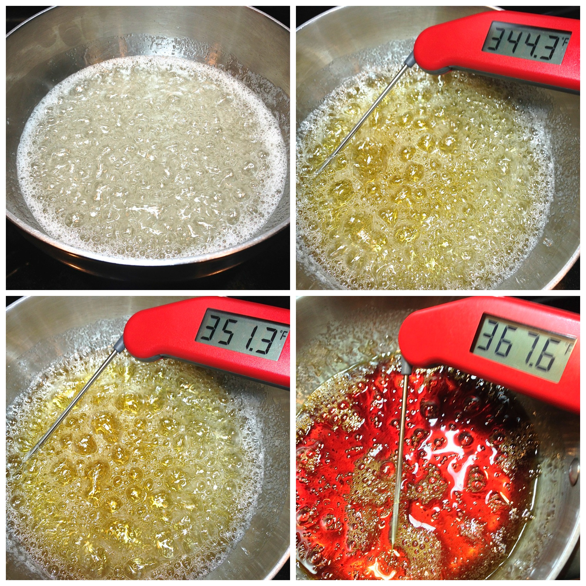 Note the final picture in the sequence above: I let my caramel overcook, and it consequently became unpleasantly bitter. It happened quickly; there's less than a two-minute span between the final two pictures (351°F vs. 367°F). Be sure your caramel doesn't go above 360°F, and stays light to medium brown – NOT mahogany brown, as happened to mine. A digital thermometer is a huge help here.