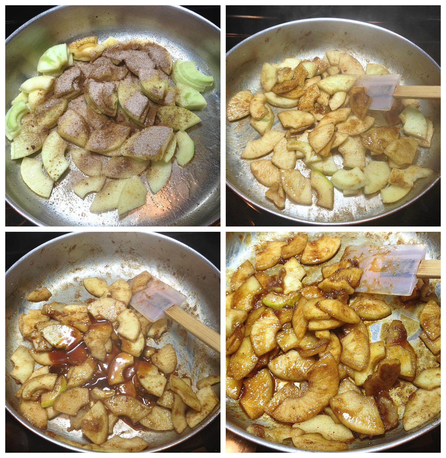 Add 2 tablespoons (25g) sugar, 1/2 teaspoon ground cinnamon, 1/4 teaspoon ground allspice, and 1/8 teaspoon each ground ginger and nutmeg. Cook for 2 minutes, stirring occasionally, then add 1 tablespoon of the prepared caramel sauce and 1 teaspoon boiled cider. Cook for 1 minute more, then remove from the heat.